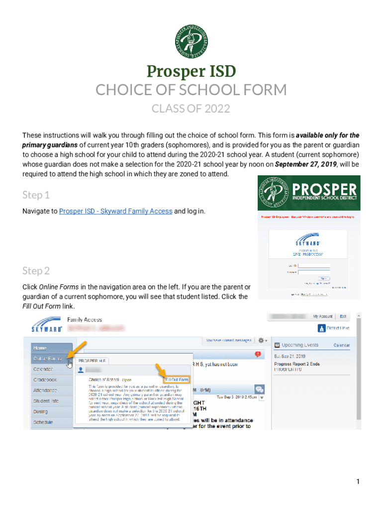Prosper ISD CHOICE OF SCHOOL FORM CLASS OF 2022 These instructions will walk you through lying out the choice of school form. This form is available only for the primary guardians of current year
