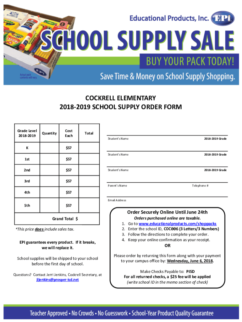 Get the free COCKRELL ELEMENTARY 2018-2019 SCHOOL SUPPLY ORDER FORM