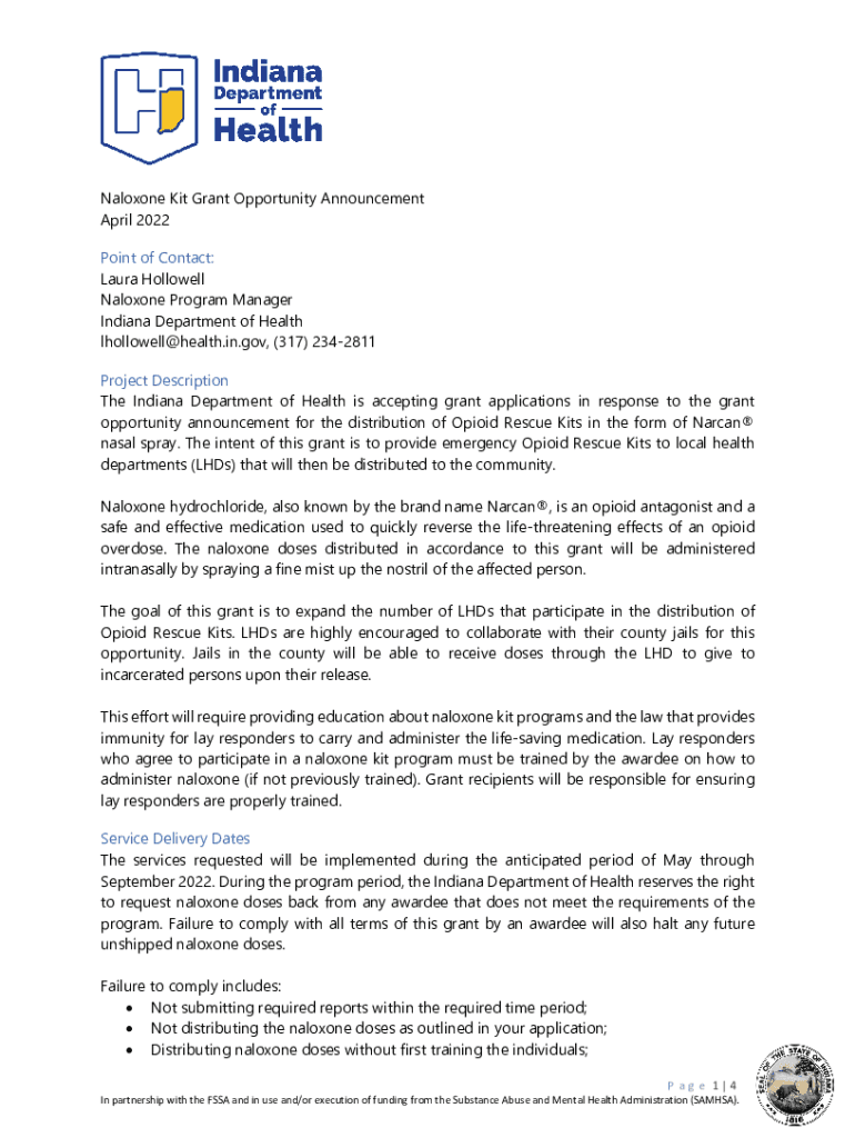 Naloxone Kit Grant Opportunity Announcement April 2022 Point of Contact: Laura Hollow ell Naloxone Program Manager Indiana Department of Health lhollowell@health.in.gov, (317) 2342811 Project Description