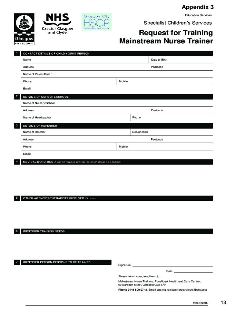 Appendix 3 Education ServicesSpecialist Children's ServicesRequest for Training Mainstream Nurse Trainer 1CONTACT DETAILS OF CHILD/YOUNG PERSON Name Date of BirthAddressPostcodeName of Parent/Carer