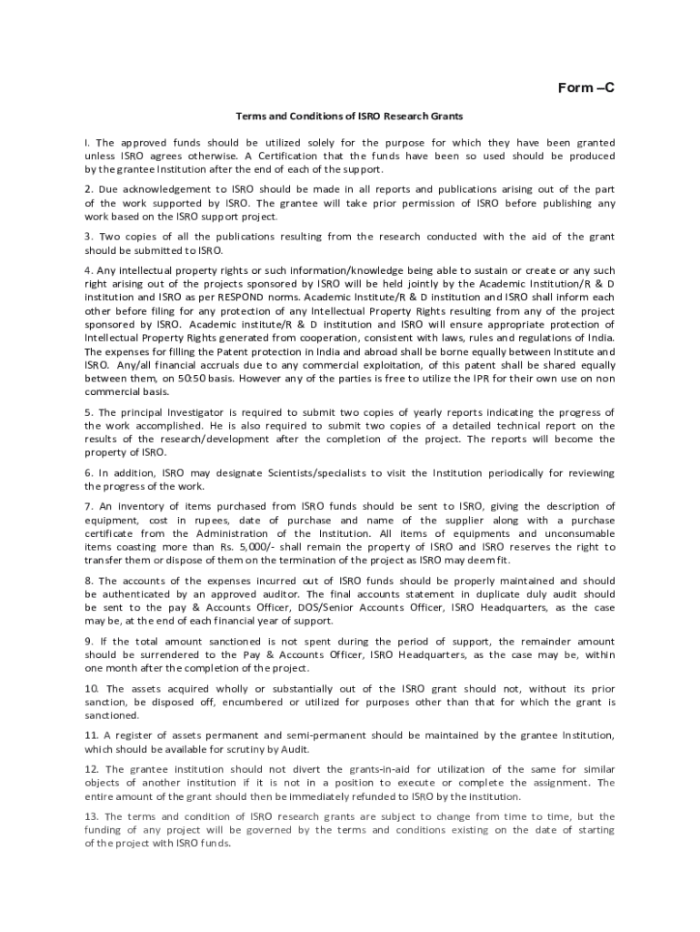 Form C Terms and Conditions of ISRO Research Grants l. The approved funds should be utilized solely for the purpose for which they have been granted unless ISRO agrees otherwise. A Certification that