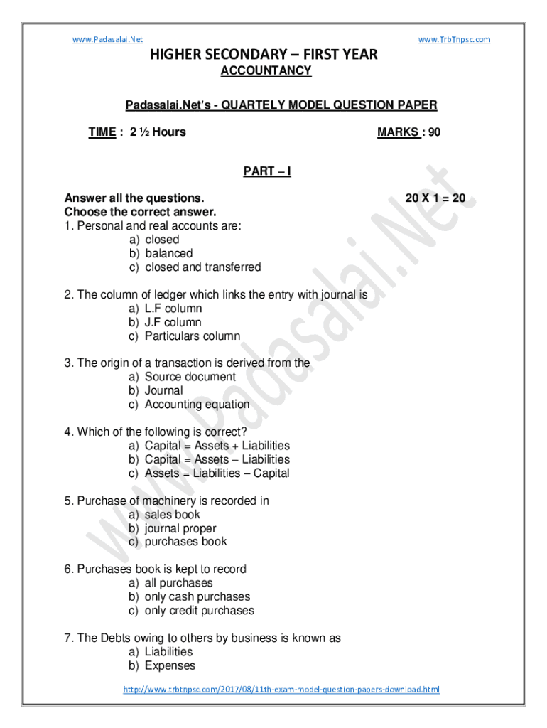 WWW. Padasalai. New. TrbTnpsc.higher SECONDARY FIRST YEAR ACCOUNTANCY Padasalai. Nets QUARTERLY MODEL QUESTION PAPER TIME : 2 Outsmarts : 90PART I Answer all the questions. Choose the correct answer.