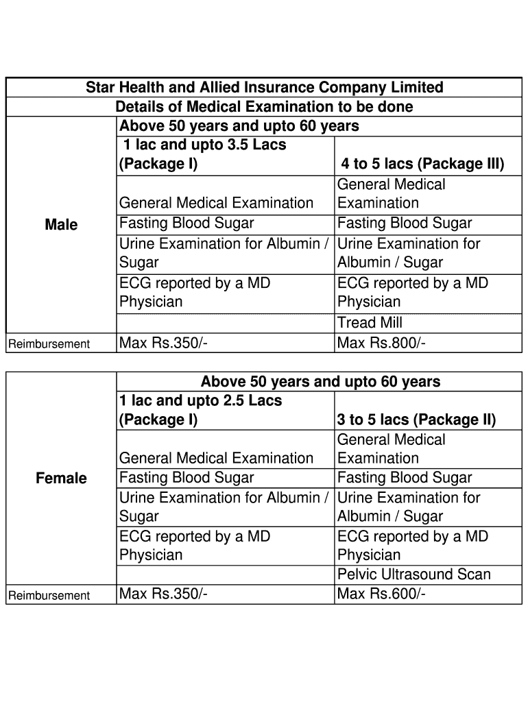 Star Health and Allied Insurance Company Limited Details of Medical Examination to be done Above 50 years and unto 60 years 1 lac and unto 3.5 Lack (Package I) 4 to 5 lack (Package III) General Medical