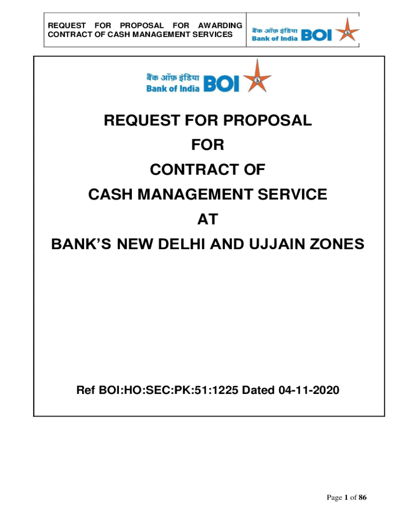 REQUEST FOR PROPOSAL FOR AWARDING CONTRACT OF CASH MANAGEMENT SERVICESREQUEST FOR PROPOSAL FOR CONTRACT OF CASH MANAGEMENT SERVICE AT BANKS NEW DELHI AND UJJAIN Zones BOI:HO:SEC:PK:51:1225 Dated 04112020Page