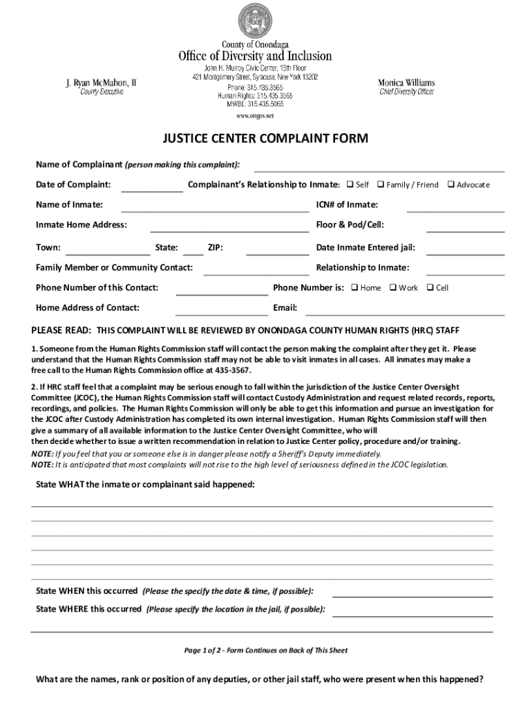 JUSTICE CENTER COMPLAINT FORM Name of Complainant (person making this complaint): Complainants Relationship to Inmate: Self Family / Friend Advocate Date of Complaint: Name of Inmate:ICN# of Inmate:Inmate