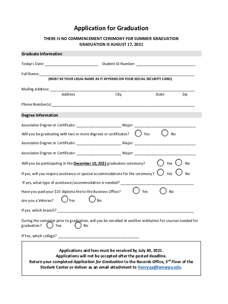 Application for Graduation THERE IS NO COMMENCEMENT CEREMONY FOR SUMMER GRADUATION IS AUGUST 17, 2021, Graduate Information Today's Date: ___ Student ID Number: ___ Full Name:___ (MUST BE YOUR LEGAL