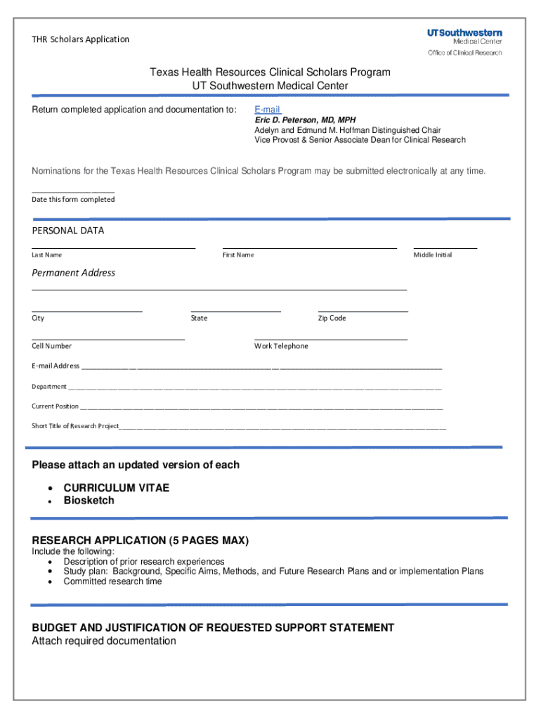 THE Scholars Application Texas Health Resources Clinical Scholars Program UT Southwestern Medical Center Return completed application and documentation to:Email Eric D. Peterson, MD, MPH Madelyn and