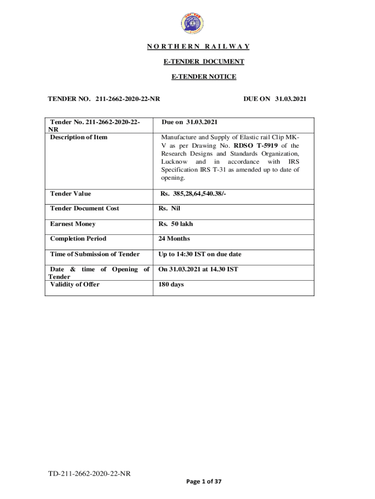 NORTHERN RAILWAY TENDER DOCUMENT TENDER NOTICETENDER NO. 2112662202022NRTender No. 2112662202022NR Description of Itemize ON 31.03.2021Due on 31.03.2021 Manufacture and Supply of Elastic rail Clip