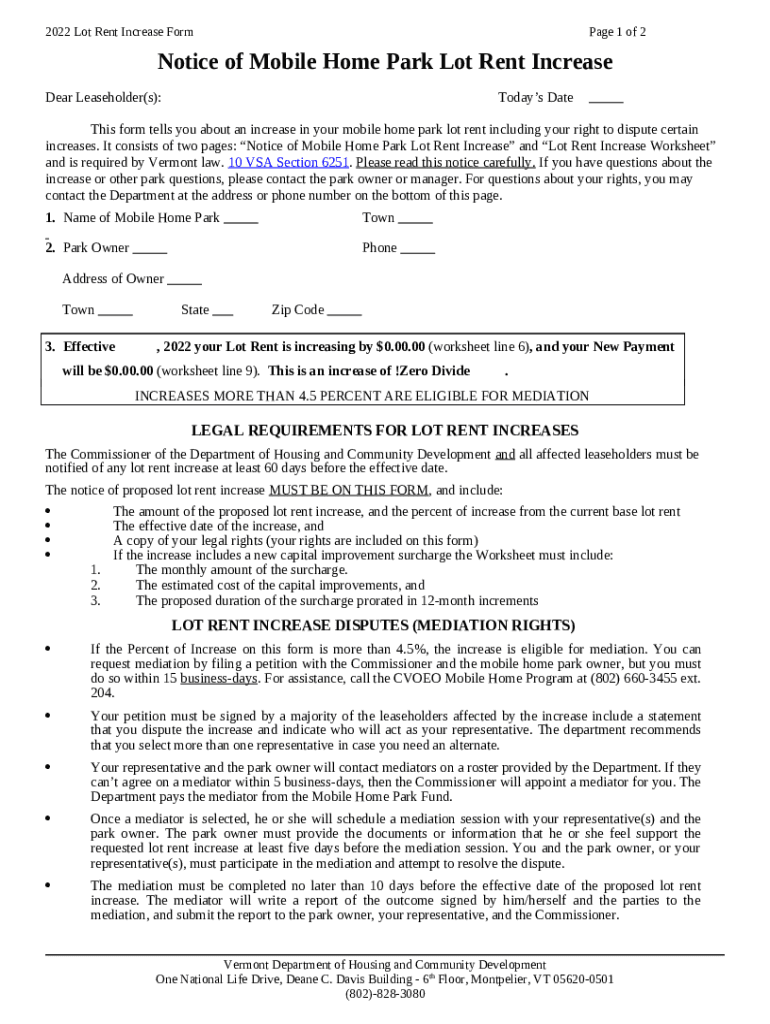 What is Notice of Proposed Mobile Home Park Lot Rent Increase - Vermont - accd vermont Form?