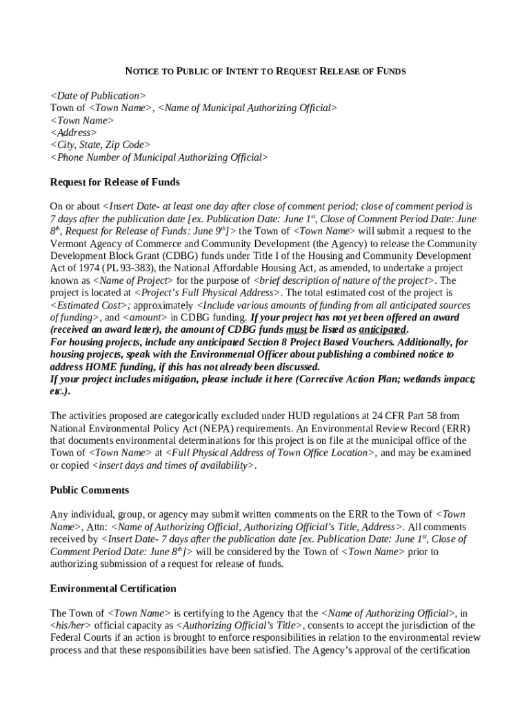 Instructions for the NOTICE OF INTENT TO REQUEST RELEASE OF FUNDS - Vermont - accd vermont form