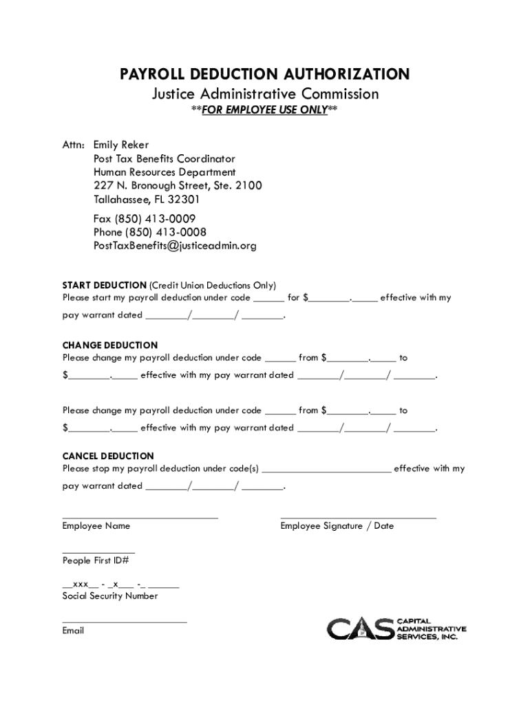 PAYROLL DEDUCTION AUTHORIZATION Justice Administrative Commission **FOR EMPLOYEE USE ONLY** Attn: Emily Refer Post Tax Benefits Coordinator Human Resources Department 227 N. Borough Street, Ste. 2100
