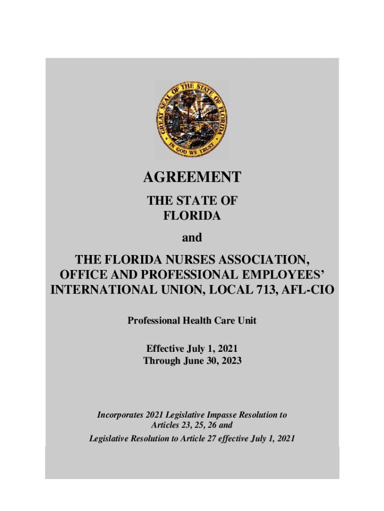 AGREEMENT THE STATE OF FLORIDA and THE FLORIDA NURSES ASSOCIATION, OFFICE AND PROFESSIONAL EMPLOYEES INTERNATIONAL UNION, LOCAL 713, AFL CIO Professional Health Care Unit Effective July 1, 2021, Through