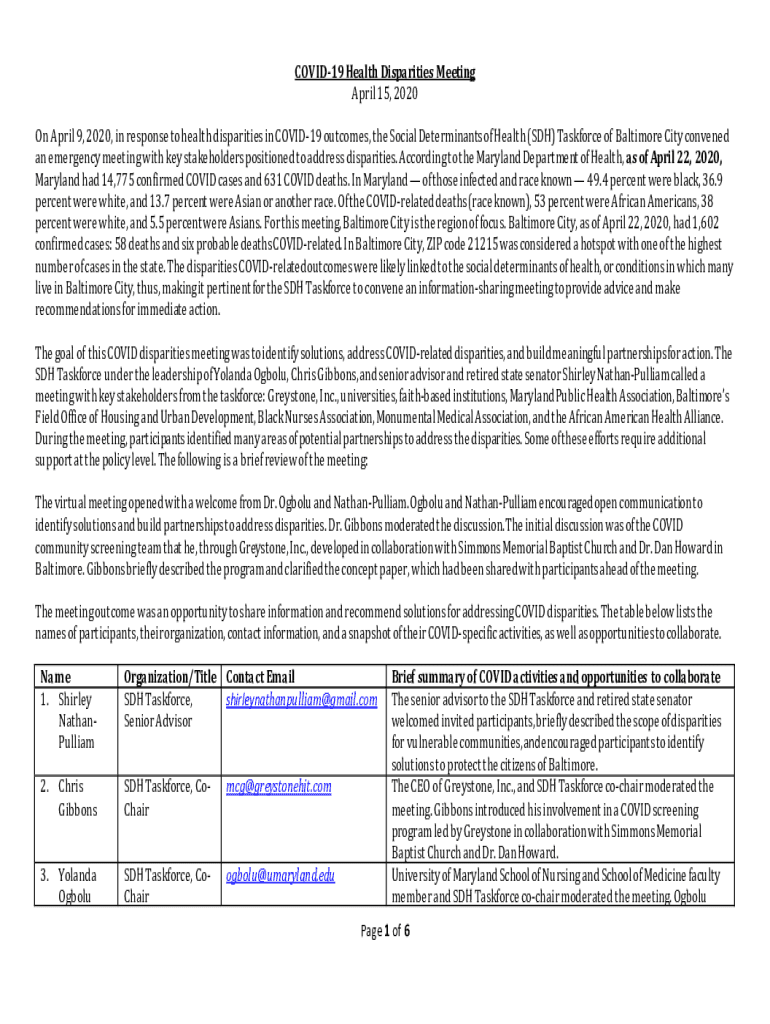 COVID-19 Health Disparities Meeting April 15, 2020On April 9, 2020, in response to health disparities in COVID-19 outcomes, the Social Determinants of Health (SDH) Taskforce of Baltimore City convened