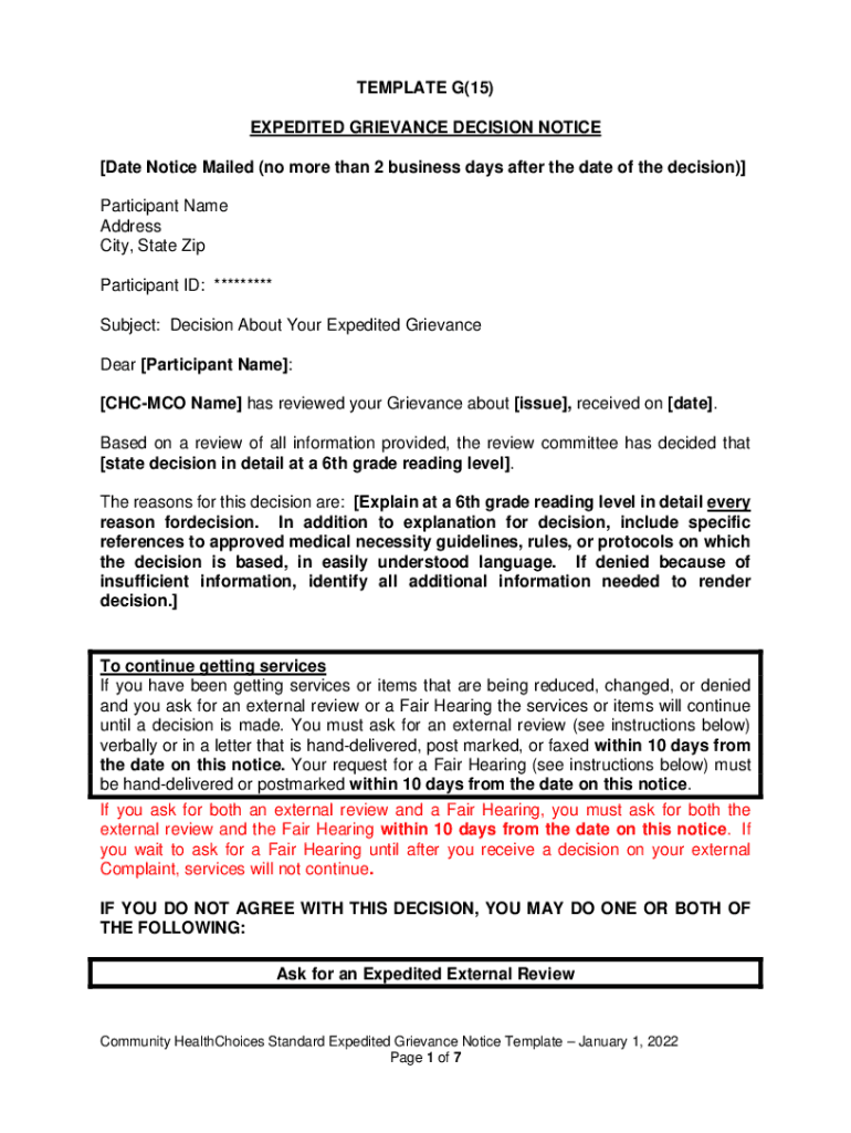 TEMPLATE G(15) EXPEDITED GRIEVANCE DECISION NOTICE [Date Notice Mailed (no more than 2 business days after the date of the decision)] Participant Name Address City, State Zip Participant ID: *********