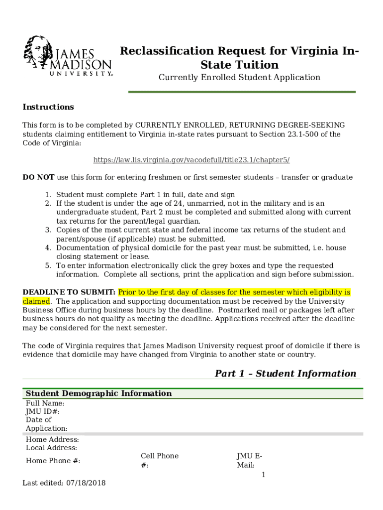 The Eligibility for Virginia In-State Tuition Privileges is a writable document you can get completed and signed for specific purpose. In that case, it is provided to the actual addressee to provide specific details and data. The completion and signing is able manually in hard copy or with a suitable service like PDFfiller. These services help to send in any PDF or Word file without printing them out. It also lets you edit its appearance according to your needs and put legit digital signature. Once done, the user ought to send the Eligibility for Virginia In-State Tuition Privileges to the respective recipient or several recipients by mail and also fax. PDFfiller is known for a feature and options that make your Word form printable. It offers various settings when printing out appearance. It does no matter how you distribute a document - physically or by email - it will always look well-designed and organized. In order not to create a new document from scratch again and again, make the original file into a template. Later, you will have a rewritable sample.