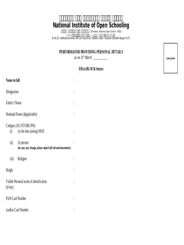 The National Institute of Open Schooling - Spark is a document you can get completed and signed for specified reasons. Next, it is furnished to the exact addressee to provide some information of certain kinds. The completion and signing can be done or using an appropriate solution like PDFfiller. Such services help to send in any PDF or Word file without printing them out. It also lets you edit its appearance according to your requirements and put a legal electronic signature. Once you're good, the user sends the National Institute of Open Schooling - Spark to the respective recipient or several recipients by mail or fax. PDFfiller provides a feature and options that make your template printable. It provides a number of settings when printing out appearance. It does no matter how you will deliver a document - physically or by email - it will always look neat and clear. In order not to create a new editable template from the beginning every time, turn the original file as a template. After that, you will have a customizable sample.