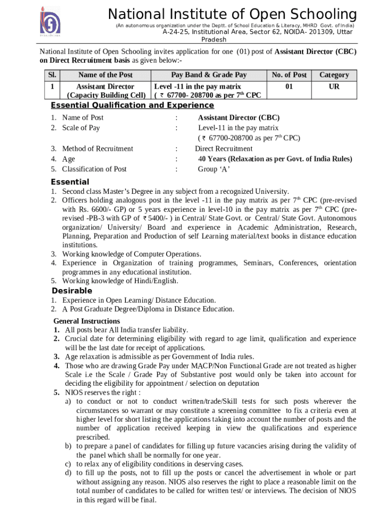 The National Institute of Open Schooling invites application for one(01) post of Assistant Director (CBC) on Direct Recruitment basis as given below:- is a writable document required to be submitted to the specific address in order to provide specific information. It has to be completed and signed, which is possible in hard copy, or using a particular software e. g. PDFfiller. This tool helps to fill out any PDF or Word document right in the web, customize it according to your needs and put a legally-binding e-signature. Right away after completion, user can easily send the National Institute of Open Schooling invites application for one(01) post of Assistant Director (CBC) on Direct Recruitment basis as given below:- to the relevant recipient, or multiple ones via email or fax. The editable template is printable as well from PDFfiller feature and options presented for printing out adjustment. In both digital and physical appearance, your form will have a organized and professional outlook. You can also turn it into a template for later, without creating a new document again. All you need to do is to amend the ready document.