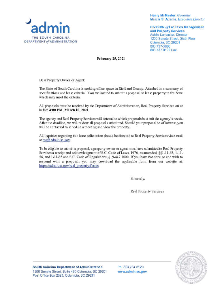 Henry McMaster, Governor Marcia S. Adams, Executive Director DIVISION of Facilities Management and Property Services Ashlee Lancaster, Director 1200 Senate Street, Sixth Floor Columbia, SC 29201 803.7373880