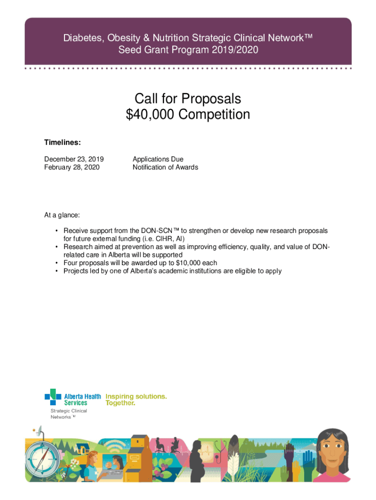 Diabetes, Obesity & Nutrition Strategic Clinical Network Seed Grant Program 2019/2020Call for Proposals $40,000 Competition Timelines: December 23, 2019, February 28, 2020Applications Due Notification