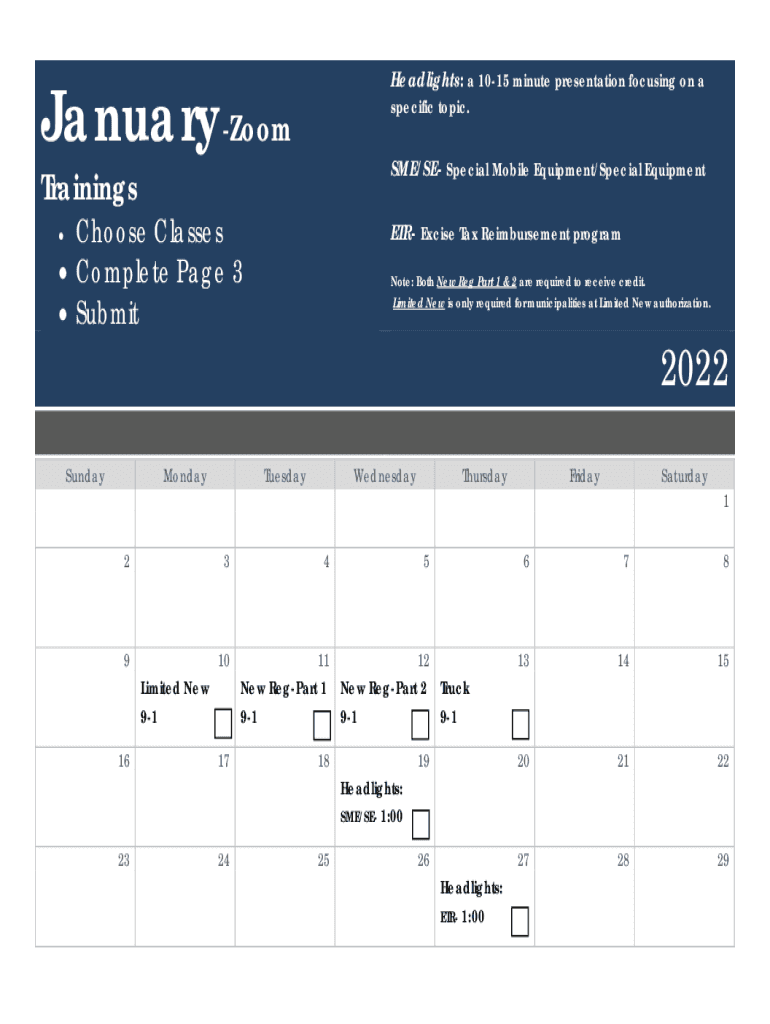 JanuaryZoomHeadlights: a 1015-minute presentation focusing on a specific topic.SME/SE Special Mobile Equipment/Special EquipmentTrainingsChoose Classes Complete Page 3 Submitter Excise Tax Reimbursement