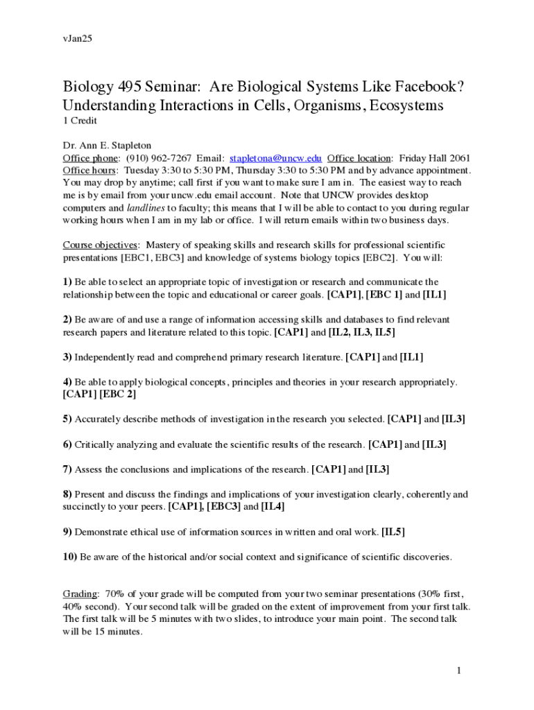 VJan25Biology 495 Seminars: Are Biological Systems Like Facebook? Understanding Interactions in Cells, Organisms, Ecosystems 1 Credit Dr. Ann E. Staple ton Office phone: (910) 9627267 Email: stapletona@uncw.edu
