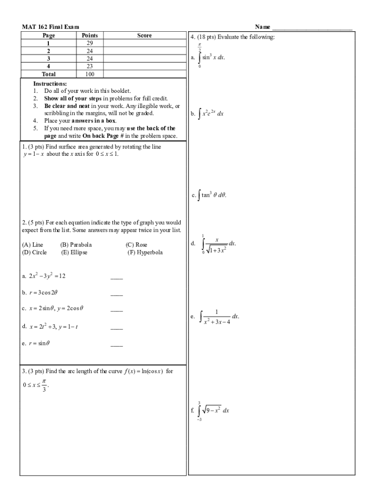 MAT 162 Final Exam Page Points Score 29 1 24 2 24 3 23 4 100 Total Instructions: 1. Do all of your work in this booklet. 2. Show all of your steps in problems for full credit. 3. Be clear and neat