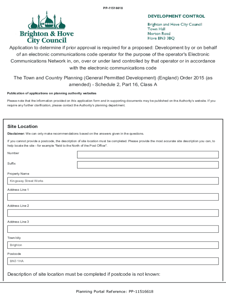 PP11516618Application to determine if prior approval is required for a proposed: Development by or on behalf of an electronic communications code operator for the purpose of the operator\'s Electronic