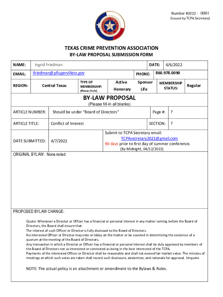 Number #2022 ___ 0001 (Issued by CPA Secretary)TEXAS CRIME PREVENTION ASSOCIATION BYLAW PROPOSAL SUBMISSION FORM NAME:Ingrid FriedmanDATE:ifriedman@pflugervilletx.dovetail: REGION:Central Texas860.978.0090PHONE:TYPE
