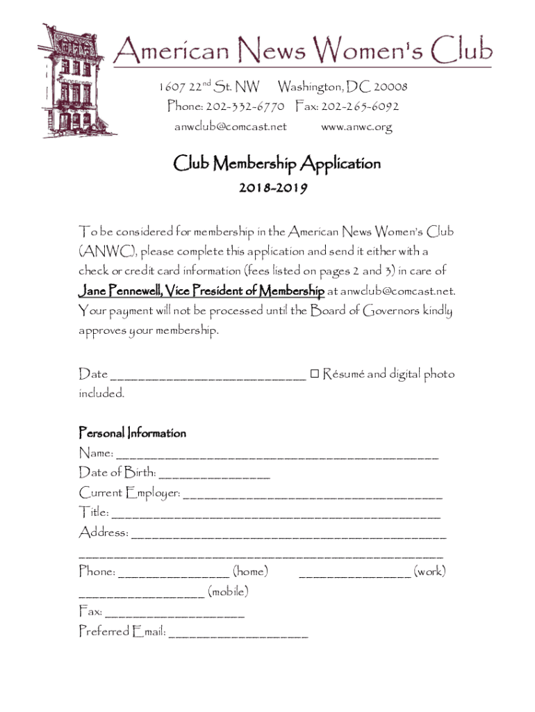1607 22nd St. NW Washington, DC 20008Phone: 2023326770 Fax: 2022656092 anwclub@comcast.netwww.anwc.orgClub Membership Application 20182019 To be considered for membership in the American Newswomen's