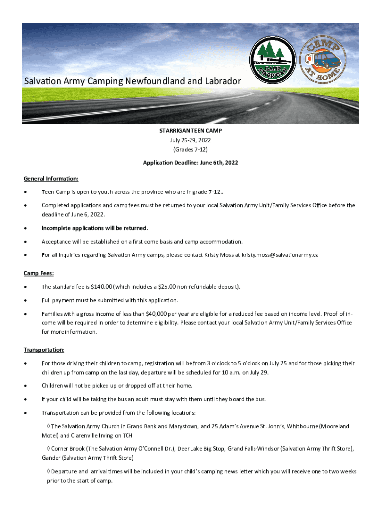 Salvation Army Camping Newfoundland and LabradorSTARRIGAN TEEN CAMP July 2529, 2022 (Grades 712) Application Deadline: June 6th, 2022 General Information: Teen Camp is open to youth across the province