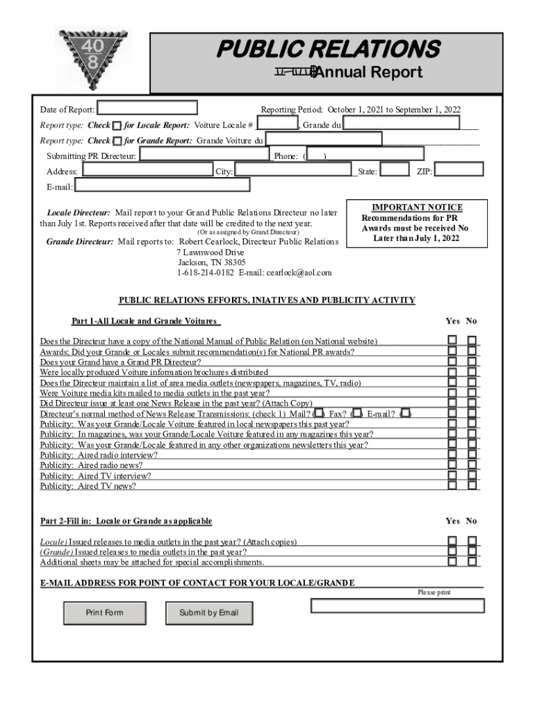 PUBLIC RELATIONS Annual Reportage of Report: ___Reporting Period: October 1, 2021, to September 1, 2022Report type: Check () for Locale Report: Venture Locale # ___, Grande Du ___ Report type: Check