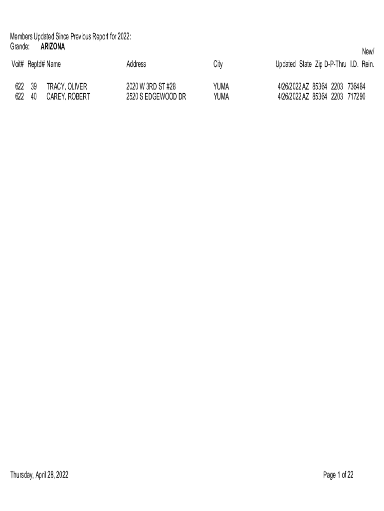 Members Updated Since Previous Report for 2022: Grande: ARIZONA Void# Kept# Name 622 62239 40TRACY, OLIVER CAREY, ROBERTThursday, April 28, 2022AddressCity2020 W 3RD ST #28 2520 S EDGEWOOD DRY UMA