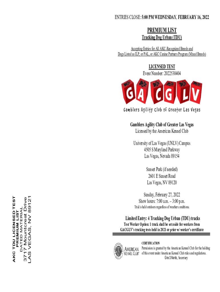ENTRIES CLOSE: 5:00 PM WEDNESDAY, FEBRUARY 16, 2022PREMIUM Distracting Dog Urban (CDU) Accepting Entries for All Recognized Breeds and Dogs Listed as ILP, or PAL, or AKC Canine Partners Program (Mixed