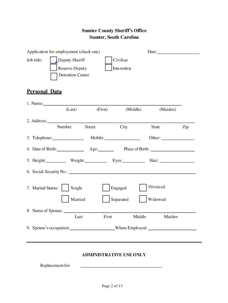 Sumter County Sheriffs Office Application for EmploymentSheriff Anthony Dennis 1281 NORTH MAIN STREET SUMTER, SC 29153 P.O. Box 430 Sumter, SC 291510430The following items MUST be turned in with the