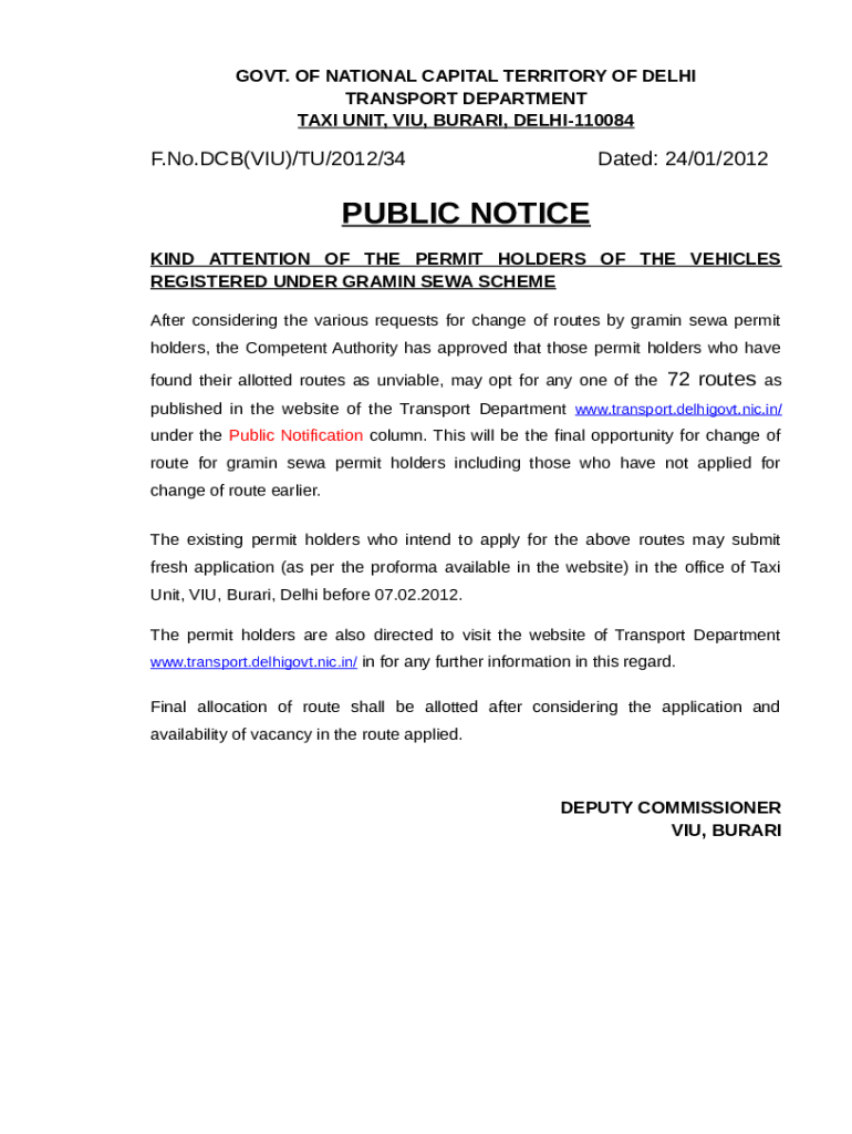 The Official Website of Transport Department,Government of NCT of Delhi, India is a writable document you can get completed and signed for certain purposes. Next, it is furnished to the relevant addressee in order to provide specific details of any kinds. The completion and signing is available in hard copy or using a suitable application e. g. PDFfiller. Such applications help to send in any PDF or Word file online. While doing that, you can customize its appearance according to your requirements and put a valid e-signature. Once done, the user ought to send the Official Website of Transport Department,Government of NCT of Delhi, India to the respective recipient or several of them by mail and even fax. PDFfiller is known for a feature and options that make your Word form printable. It provides different options when printing out. It does no matter how you will distribute a form - physically or electronically - it will always look professional and organized. In order not to create a new editable template from the beginning every time, make the original form as a template. After that, you will have a customizable sample.