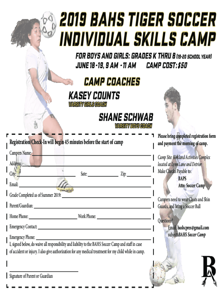 2019 BASS Tiger Soccer Individual Skills Camp for Boys and Girls: Grades K through 8 (1920 School Year) June 18 19, 9 am 11 am Camp Cost: $ 50Camp Coaches Kasey Counts Varsity Girls Coach Shane Schwab,