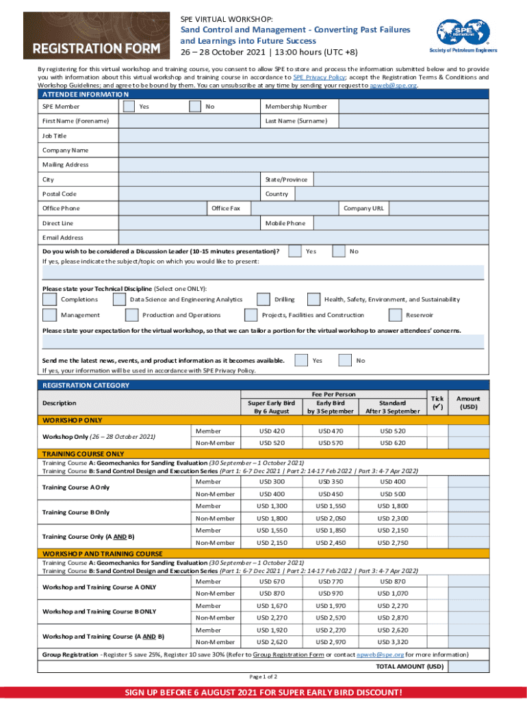 PRINCIPAL SPONSOR SPE Virtual Workshop: Sand Control and Management Converting Past Failures and Learnings into Future Success 26 28 October 2021 | VIRTUAL [UTC+8]Sign up before 3 September 2021 for