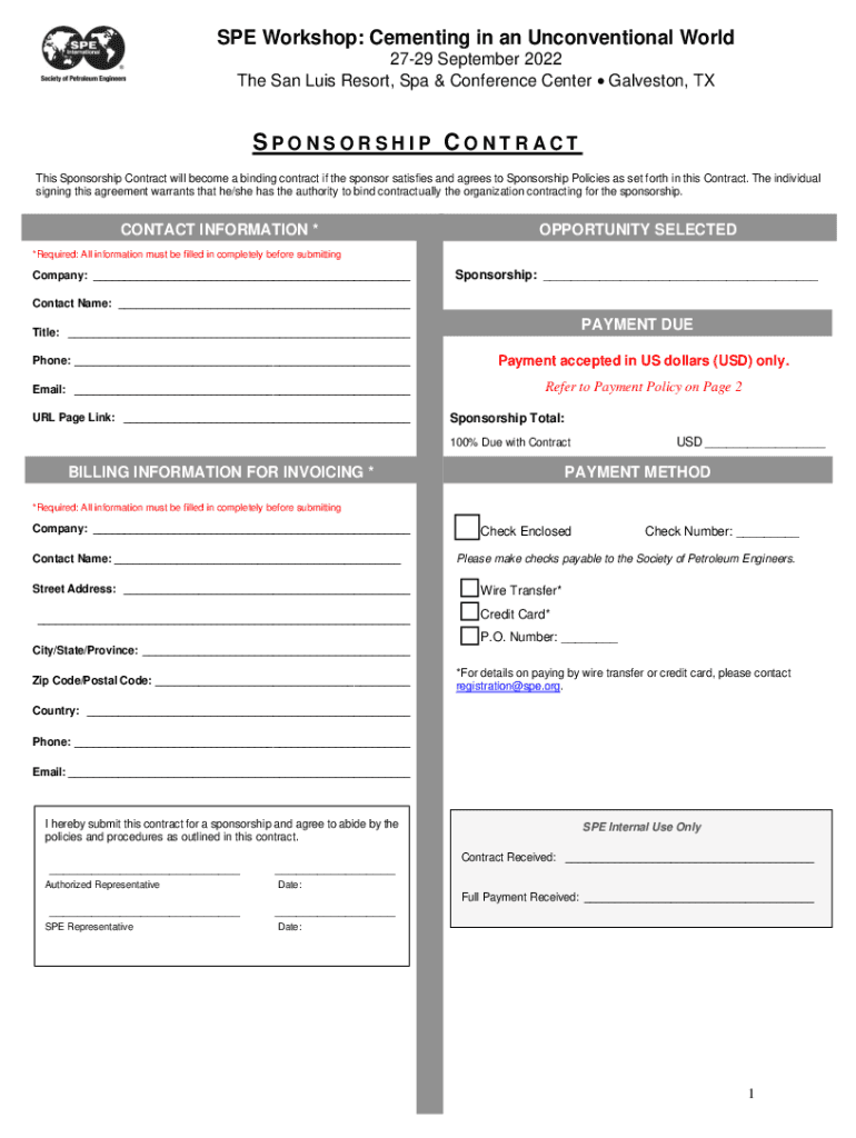 SPE Workshop: Cementing in an Unconventional World 2729 September 2022 The San Luis Resort, Spa & Conference Center Galveston, SPONSORSHIP CONTRACT This Sponsorship Contract will become a binding