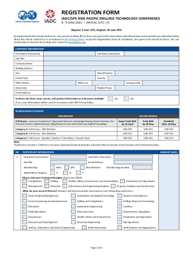 REGISTRATION FORM IADC/SPE ASIA PACIFIC DRILLING TECHNOLOGY CONFERENCE 8 9 JUNE 2021 VIRTUAL (UTC +7)Register 5 save 15%, Register 10 save 20% By registering for this virtual conference, you consent
