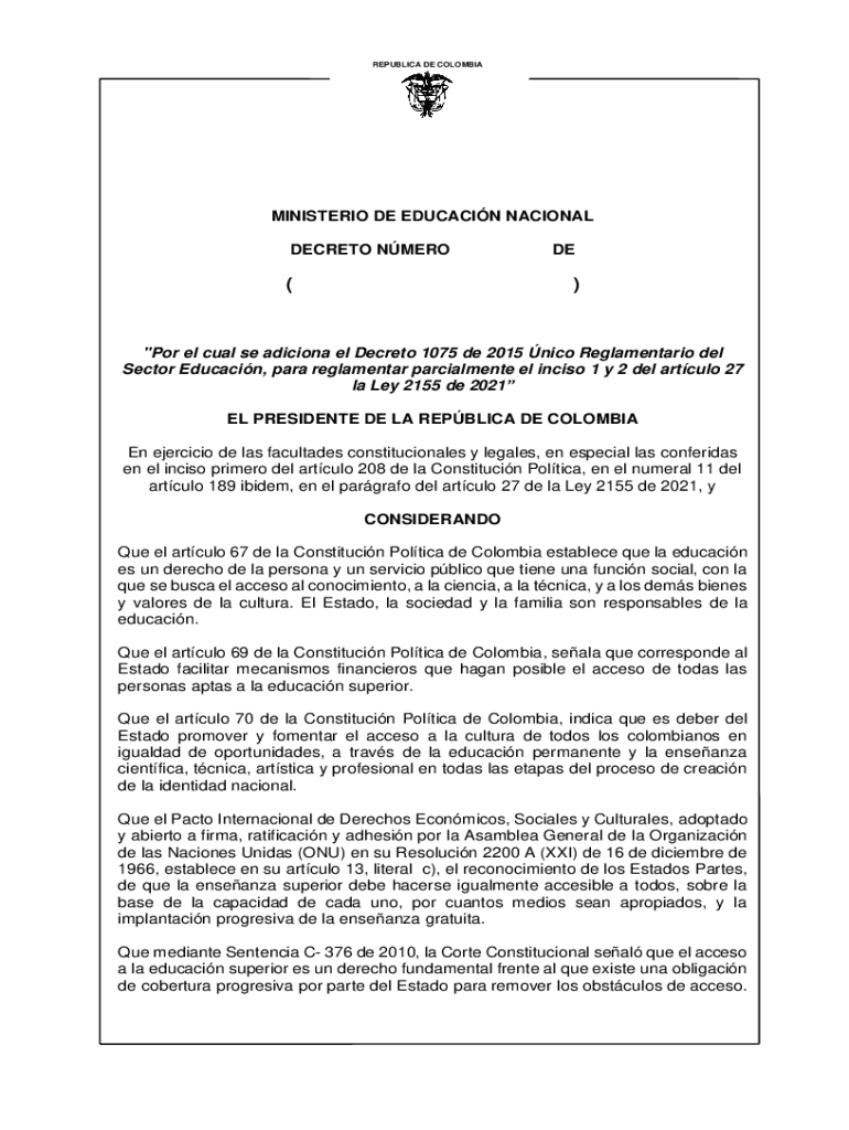 REPUBLICAN DE COLOMBIA MINISTER DE EDUCATION NATIONAL SECRET NERO(DE)\” Po rel coal SE addition el Secret 1075 DE 2015 Nico Reglamentario Del Sector Education, para regimental Parliament El incisor