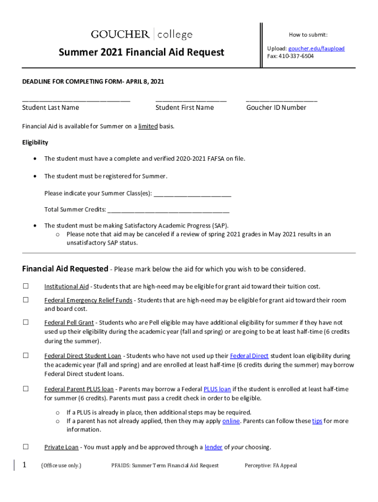 How to submit: Upload: goucher.edu/faupload Fax: 4103376504Summer 2021 Financial Aid Request DEADLINE FOR COMPLETING FORM APRIL 8, 2021 _________Student Last NameStudent First NameGoucher ID NumberFinancial