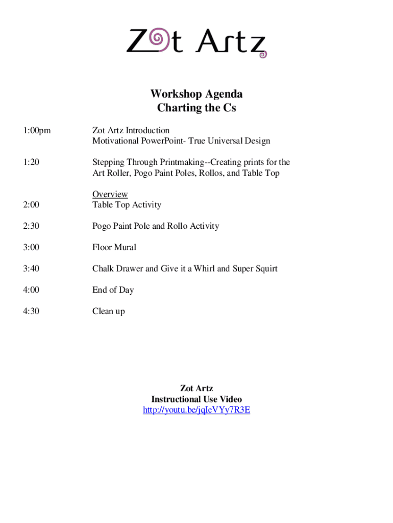 Workshop Agenda Charting the Cs 1:00pmZot Art Introduction Motivational PowerPoint True Universal Design1:20Stepping Through PrintmakingCreating prints for the Art Roller, Pogo Paint Poles, Rolls,