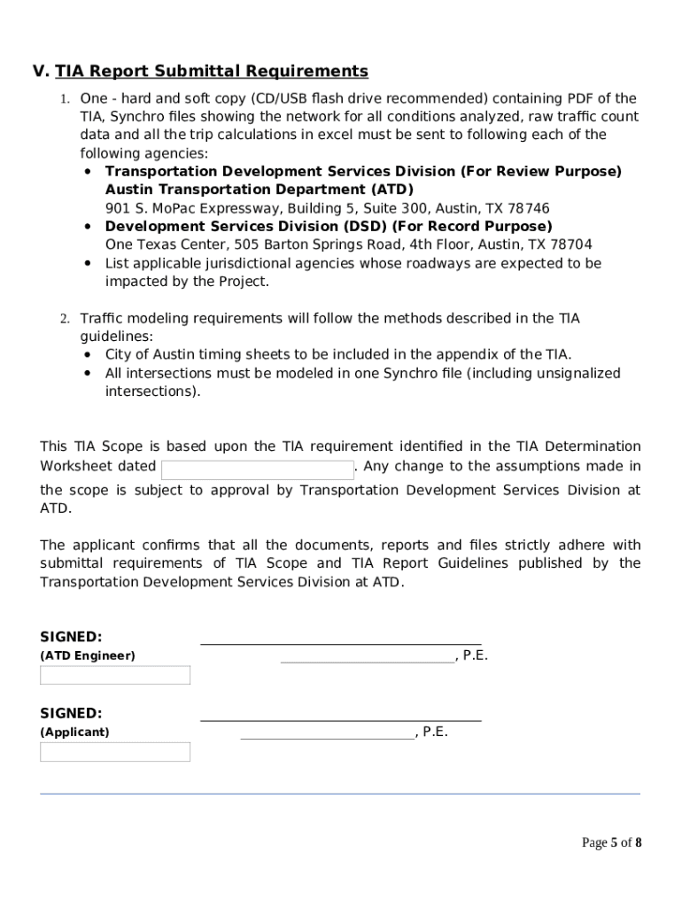 The TRANSPORTATION IMPACT ANALYSIS SCOPE OF WORK - Austin, Texas is a document you can get filled-out and signed for specified purpose. Then, it is furnished to the exact addressee to provide specific details and data. The completion and signing may be done or using an appropriate application e. g. PDFfiller. Such applications help to send in any PDF or Word file online. It also allows you to edit its appearance depending on the needs you have and put an official legal e-signature. Once you're good, the user ought to send the TRANSPORTATION IMPACT ANALYSIS SCOPE OF WORK - Austin, Texas to the respective recipient or several recipients by mail and even fax. PDFfiller has a feature and options that make your template printable. It includes a number of options for printing out appearance. It does no matter how you'll deliver a form after filling it out - in hard copy or electronically - it will always look neat and organized. To not to create a new file from scratch every time, turn the original Word file as a template. Later, you will have a customizable sample.