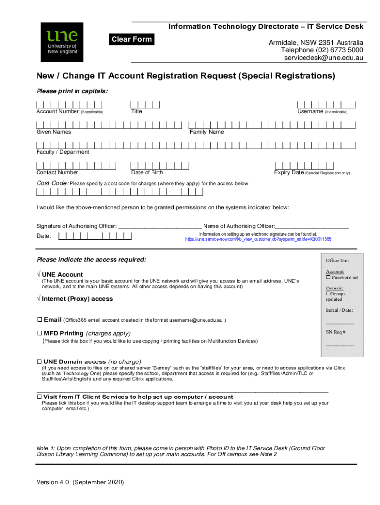 Information Technology Directorate IT Service Desk Clear FormArmidale, NSW 2351 Australia Telephone (02) 6773 5000 servicedesk@une.edu.auNew / Change IT Account Registration Request (Special Registrations)
