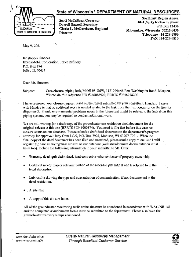 T\'..., _ i. \'State of Wisconsin DEPARTMENT OF NATURAL RESOURCESWISCONSIN DEPT. OF NATURAL RESOURCES Scott McCallum, Governor Darrell Barbell, Secretary Gloria L. Escutcheon, Regional Director Southeast