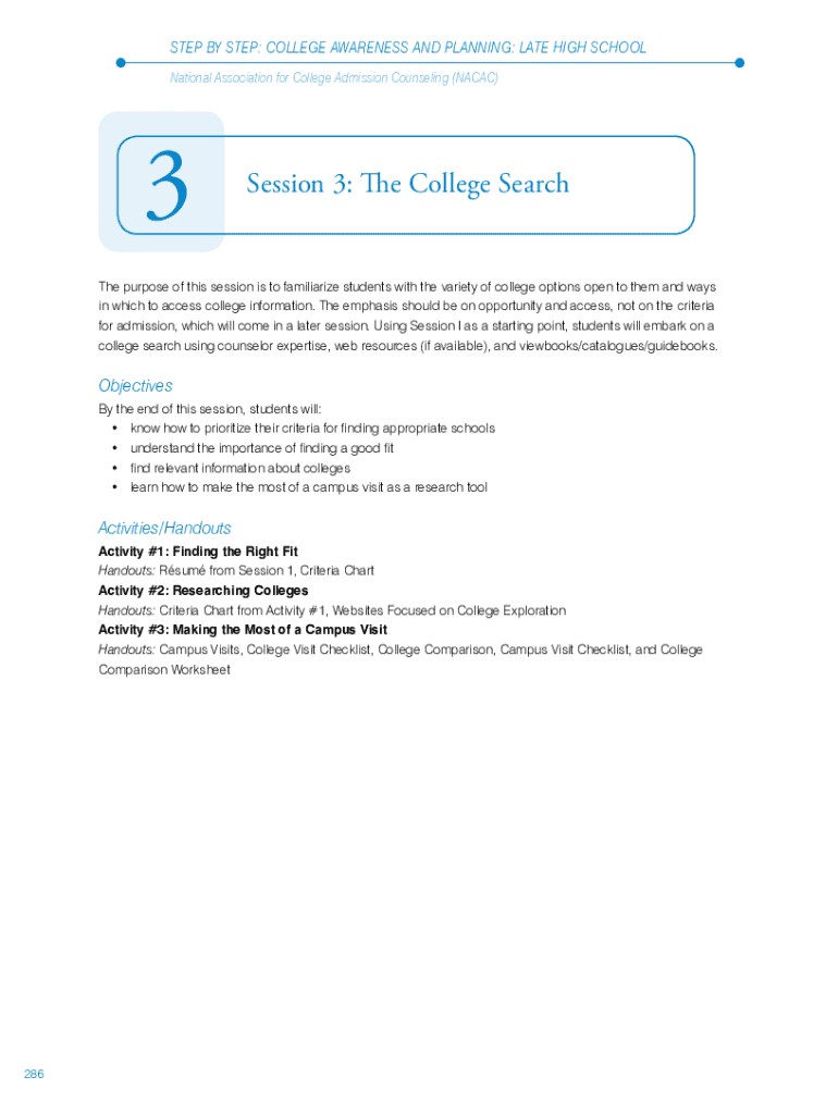 STEP BY STEP: COLLEGE AWARENESS AND PLANNING: LATE HIGH SCHOOL National Association for College Admission Counseling (NACA)3Session 3: The College Search purpose of this session is to familiarize