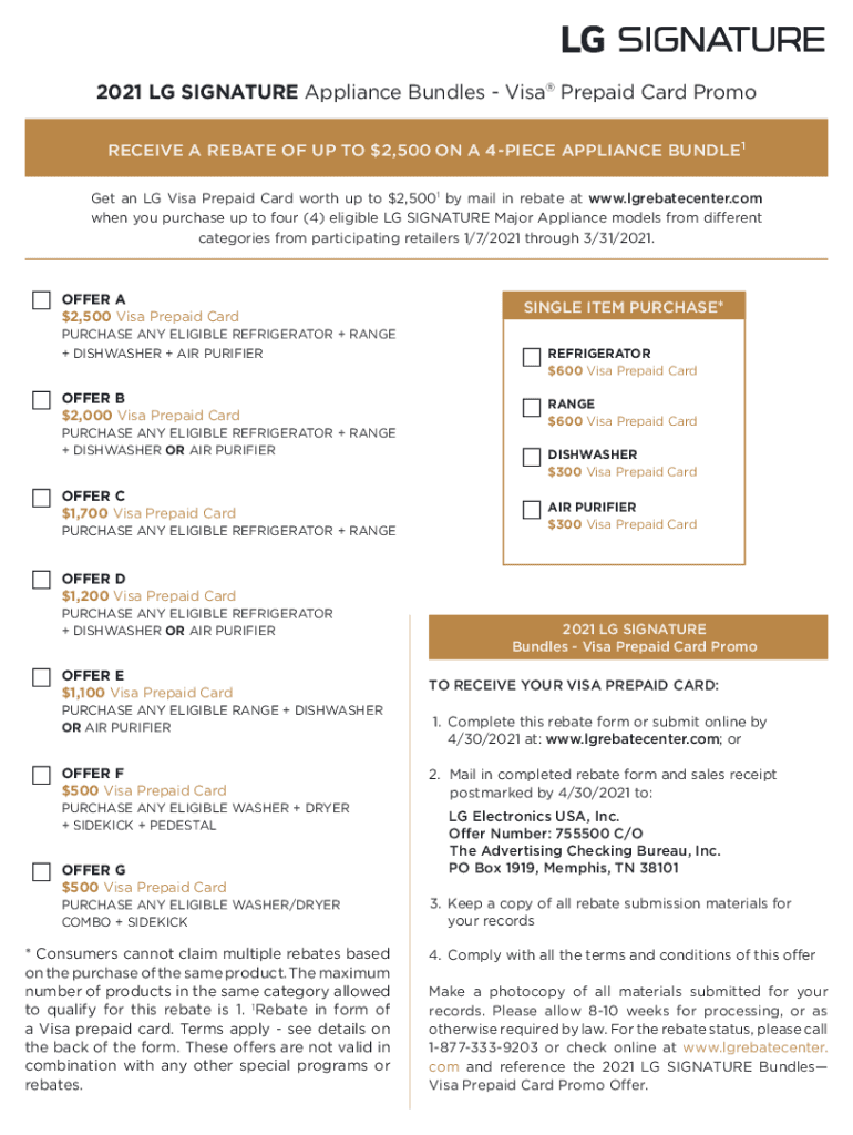 2021 LG SIGNATURE Appliance Bundles Visa Prepaid Card Promo RECEIVE A REBATE OF UP TO $2,500 ON A 4PIECE APPLIANCE BUNDLE1 Get an LG Visa Prepaid Card worth up to $2,5001 by mail-in rebate at www.lgrebatecenter.com