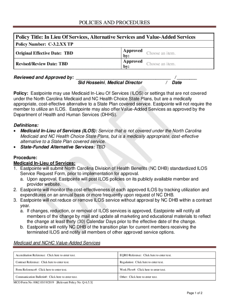 POLICIES AND PROCEDURES Policy Title: In Lieu Of Services, Alternative Services and Valuated Services Policy Number: C3.2.XX TP Original Effective Date: TBD Revised/Review Date: Approved Choose an