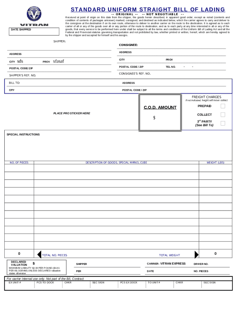 Straight Bill Of Lading Short Original Not Negotiable: ... template instructions