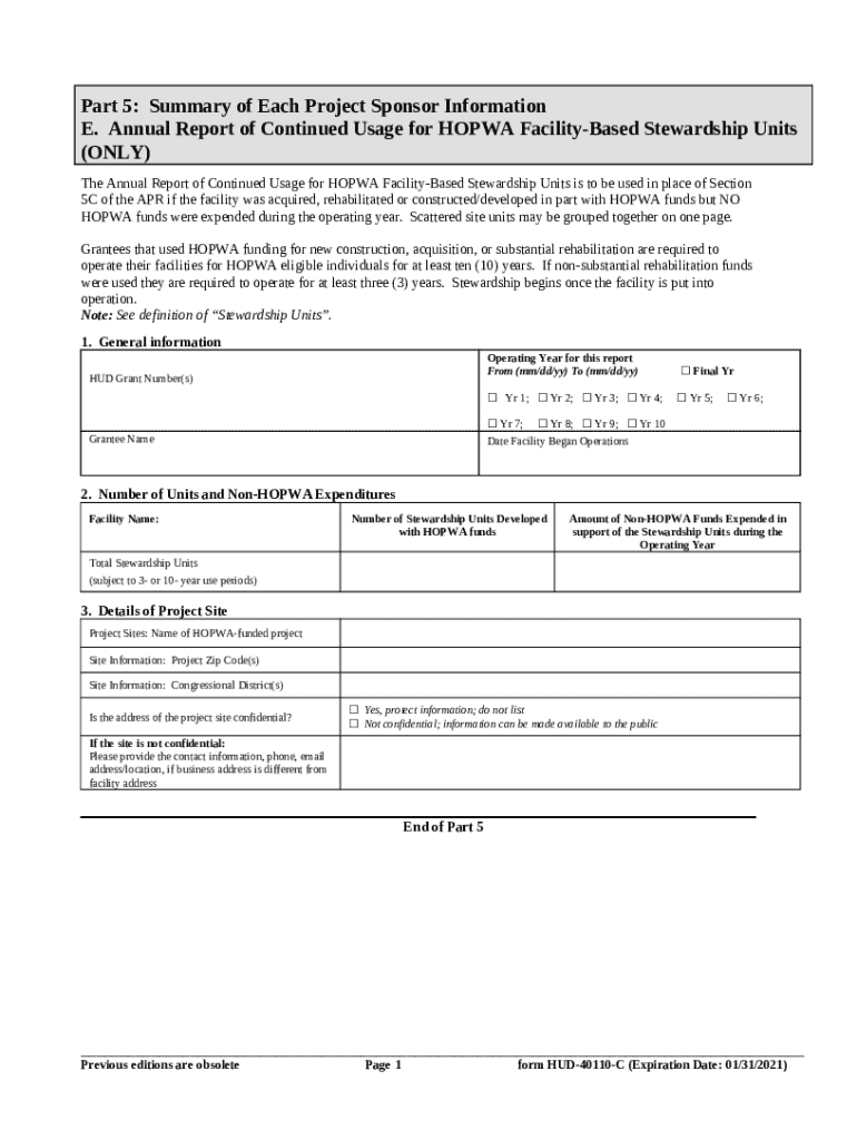 The collaboration.acgov.orgkmt-apr-stewardship-HOPWA Annual Progress Report (APR): HUD-40110-C is a writable document that has to be filled-out and signed for specified purposes. Next, it is provided to the relevant addressee to provide some info and data. The completion and signing is available or using a suitable tool e. g. PDFfiller. These applications help to send in any PDF or Word file online. While doing that, you can customize its appearance depending on your requirements and put a valid digital signature. Once you're good, you send the collaboration.acgov.orgkmt-apr-stewardship-HOPWA Annual Progress Report (APR): HUD-40110-C to the recipient or several ones by mail or fax. PDFfiller has a feature and options that make your Word template printable. It provides a number of options for printing out. It does no matter how you'll file a form - in hard copy or electronically - it will always look neat and organized. To not to create a new file from the beginning again and again, turn the original file into a template. After that, you will have a rewritable sample.